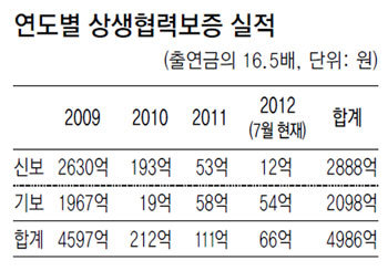 그러나 새누리당 송광호 의원이 22일 신보와 기보에서 받은 자료에 따르면 대기업과 은행은 2009년 4월 이후 지금까지 330억4000만 원을 출연했다. 원래 약속한 금액의 34.2% 수준이다. 협약 첫해인 2009년에는 신보와 기보가 상생보증 프로그램을 통해 중소기업에 4597억 원을 보증 지원했으나 2010년 212억 원, 2011년 111억 원, 올해 7월까지 66억 원을 대출하는 등 매년 급감해 대기업들이 첫해 시늉만 했다는 지적이 제기된다.