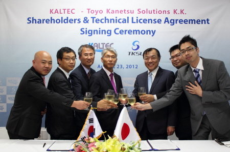 지난 23일 칼텍 기술연구소에서는 칼텍과 일본 TKK 그룹의 계열사 Toyo Kanetsu Solutions K.K.(TKSL / 대표 야나가와)의 체결식이 열렸다. 이번 협약을 통해 TKSL은 칼텍 주식의 일정 지분을 매입하고, 2015년까지 에코로베이어(Ecoloveyor) 등의 이송설비 기술을 이전한다.