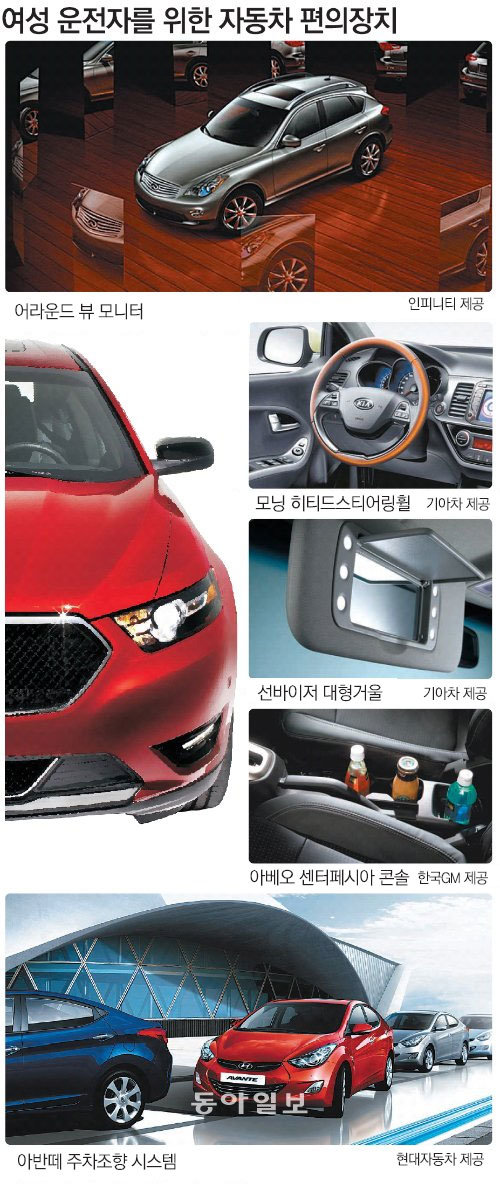 여성 운전자가 늘면서 이들을 사로잡기 위한 자동차회사들의 전략도 다양해지고 있다. 경찰청에 따르면 지난해 말 현재 여성 운전면허 취득자는 1000만7760명으로 전체 면허 소지자의 39.5%에 이른다. 과거 여성의 눈을 만족시키기 위해 여성 취향의 디자인을 도입하는 데 머물렀던 시도는 여성 운전자를 감동시키는 각종 편의장치로 확대됐다.
