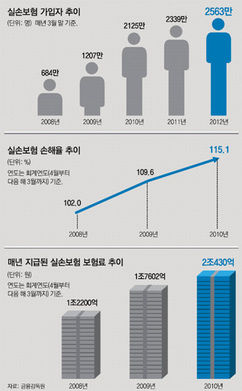 실손보험 손해율도 가파르게 오르고 있다. 손해율은 2008회계연도 102.0%에서 2010회계연도에는 115.1%로 올라갔다. 손보사들이 가입자들로부터 보험료 1만 원을 받아서 보험금은 1만1510원을 내주고 있다는 뜻이다. 치료비 전액을 돌려받을 수 있어 가입자들이 병원을 돌아다니면서 ‘의료 쇼핑’을 한 게 손해율 상승의 주원인이라고 보험업계는 설명한다.