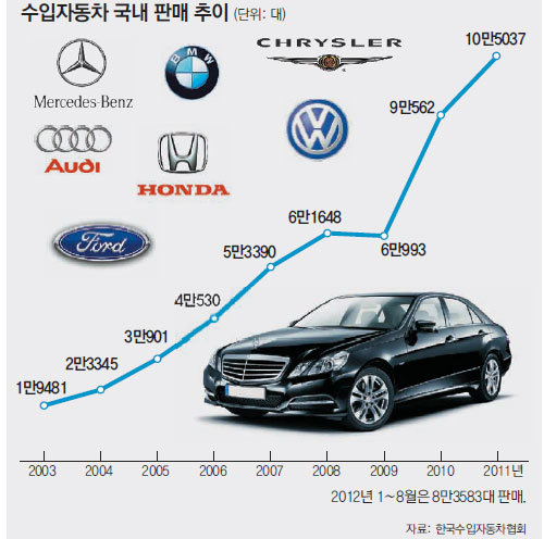 국내 승용차 시장에서 수입자동차의 누적 점유율이 올해 처음으로 10%를 넘었다. 1987년 수입차의 전면 개방 이후 25년 만이다.