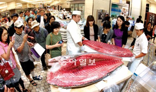 5일 서울 서초구 반포동 신세계백화점 강남점을 찾은 고객들이 대형 참치의 해체작업을 구경하며 휴대전화로 사진을 찍고 있다. 스페인에서 잡은 이 참치의 무게는 250kg이다. 가격은 약 1500만 원이다.
