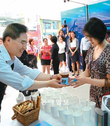하영구 한국씨티은행장(왼쪽)이 10일 오후 서울 중구 명동중앙지점에서 ‘일일 바리스타’로 변신해 고객들에게 직접 커피를 타주고 있다. 씨티은행은 이날부터 14일까지를 ‘고객 감사주간’으로 선포해 수수료 면제, 금리우대 등 다양한 이벤트를 진행한다.