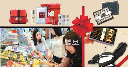 불황이라도 풍성한 마음을 전달할 수 있는 추석선물은 인기가 높다. 사진 왼쪽 위부터 시계방향으로 SK-II 스템파워 동안크림 세트, 롯데백화점 장흥 눈꽃백화고 세트, 갤러리아백화점 수삼·더덕 세트, 홈플러스 브람스 안마의자, 롯데마트에서 추석선물을 고르는 고객들.