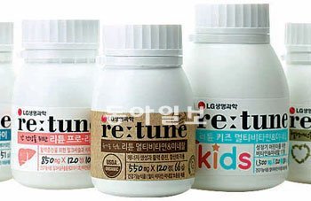 LG생명과학은 최근 건강식품 브랜드 리튠(re:tune)을 론칭하고 유기농 원료가 99% 들어간 멀티비타민과 어린이를 위한 키즈 홍삼 등 총 6개 제품을 선보였다. 눈과 간을 위한 고기능성 제품들을 비롯해 오메가3가 들어간 고기능 제품도 출시했다.