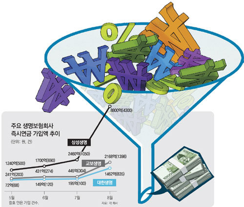 생명보험업계 ‘빅3’인 삼성, 교보, 대한생명 등 3개 생보사에 8월 한 달 동안 들어온 연금보험 보험료는 1조2430억 원에 이른다. 7월 3개 회사의 연금보험 보험료는 3100억 원에 불과했다. 한 달 사이에 연금보험 판매가 급증한 것은 정부가 지난달 초 세법 개정안을 발표한 것이 직접적인 계기였다. 현재 즉시연금은 10년 이상 장기 저축성 상품으로 분류돼 10년 이상 유지하면 이자에 대해 소득세를 부과하지 않는다. 하지만 내년 가입자부터 확정형 상품은 이자소득세(15.4%)를, 상속형은 연금소득세(5.5%)를 내도록 법이 바뀐다. 다만 종신형은 비과세 혜택이 유지된다.