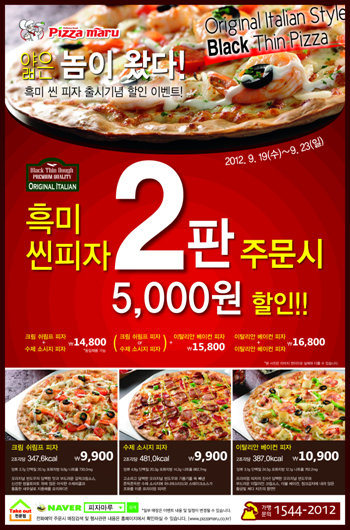 게다가 신메뉴 출시기념으로 피자마루는 오는 9월19일부터 5일간 전국 540여개의 매장에서 동시에 ‘1+1 할인이벤트’를 진행한다. 이벤트 기간 중 흑미씬피자 두 판 주문하면 즉시 현금 5,000원을 할인 받을 수 있다. 정통 이탈리안 화덕피자인 흑미씬피자 2판을 14,800원에 맛볼 수 있는 셈이다.