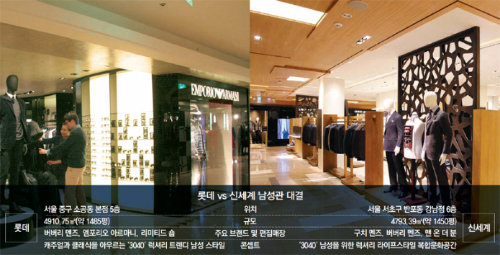 《 유통 라이벌 롯데와 신세계가 ‘남성관(館)’ 경쟁으로 맞붙었다. 출발은 신세계가 빨랐다. 국내에서 처음으로 지난해 10월 서울 서초구 반포동 강남점 6층을 통째로 3040 남성들을 위한 럭셔리 매장과 문화공간으로 바꾸고 ‘남성 전문관’이란 이름을 붙였다. 》 롯데도 반격에 나섰다. 1년간 공을 들인 끝에 21일 서울 중구 소공동 본점 5층에 남성 전문관을 연다. 수입 브랜드 비중을 늘리고 패션 외에 구두매장은 모두 지하로 내려보냈다. 이 덕분에 남성패션 매장이 330.58m²(100평) 늘어난 4910.75m²(1485.5평)로 국내 최대 규모가 됐다.