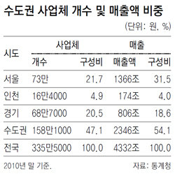 보고서에 따르면 2010년 말 기준 전국의 사업체는 총 335만5000개로 이 중 서울에 73만 개(21.7%)가 몰려 있었다. 경기 인천 등을 합한 수도권 사업체는 158만1000개로 전체의 47.1%를 차지했다. 매출액 기준으로 보면 수도권 집중 현상이 더 두드러졌다. 서울 인천 경기 사업체의 2010년 매출 총액은 2346조 원으로 전체(4332조 원)의 54%였다. 전체 사업체 종사자 중 수도권 비중도 51.4%였다.
