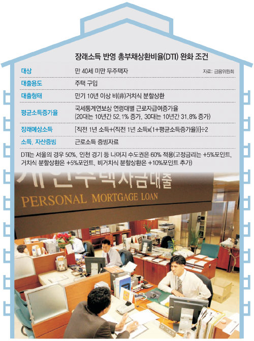 이사를 준비하는 최훈지 씨(33·가명)는 지난달 주택담보대출을 신청하러 은행에 갔다가 애를 먹은 기억이 아직 생생하다. 당시 그는 창구직원에게서 “최대한 대출을 받아도 이사에 필요한 금액보다 4000만 원가량 부족할 것”이라는 답을 들었다. DTI 한도에 걸렸기 때문이다. 최 씨는 “20일부터 DTI가 완화되며 10년 후 소득까지 반영해 대출을 받을 수 있게 됐다”며 “다시 은행에 가서 상담을 받아 봐야겠다”고 말했다.