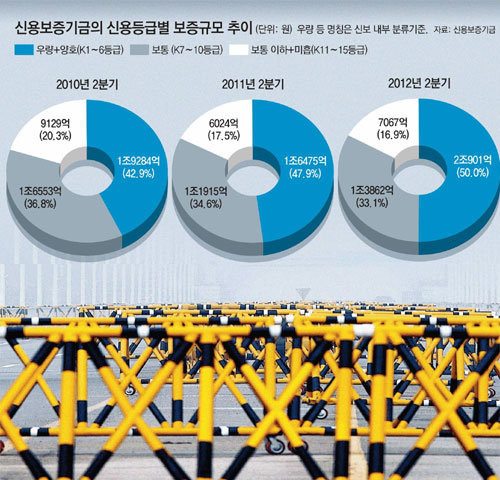 이와 관련해 동아일보가 입수한 2010∼2012년 신용보증기금의 중소기업 신규 보증 규모 자료에 따르면 올 2분기(4∼6월) 신용등급 ‘우량 및 양호(K1∼6등급)’ 기업에 지원된 보증 규모는 2조901억 원으로 2010년 2분기 1조9284억 원보다 1617억 원 늘었다.