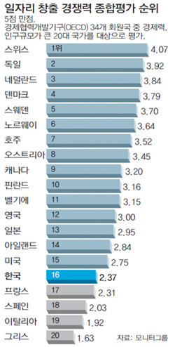 청년들을 위한 일자리 창출력으로 볼 때 한국은 일본과 비슷한 ‘잠재적 일자리 위험 국가’인 것으로 나타났다. 전체적인 일자리 창출 경쟁력 역시 한국은 경제협력개발기구(OECD) 주요 회원국 가운데 하위권에 머무는 것으로 조사됐다.