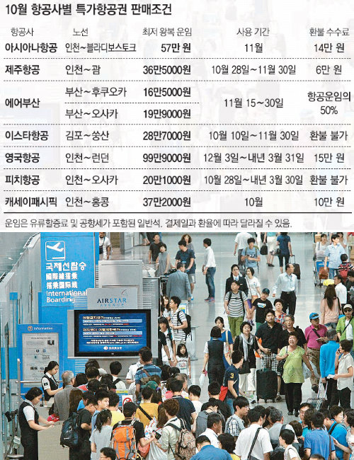 국내외 항공사들이 최근 저렴한 항공권을 잇달아 내놓고 있다. 여름 휴가철과 추석 연휴가 끝나면서 여행 수요가 줄었기 때문이다. 여기에 치열해진 노선 경쟁으로 4분기(10∼12월)에 신규 취항까지 몰리자 항공사들은 다양한 할인 혜택을 내걸고 여행객들의 관심 끌기에 한창이다.