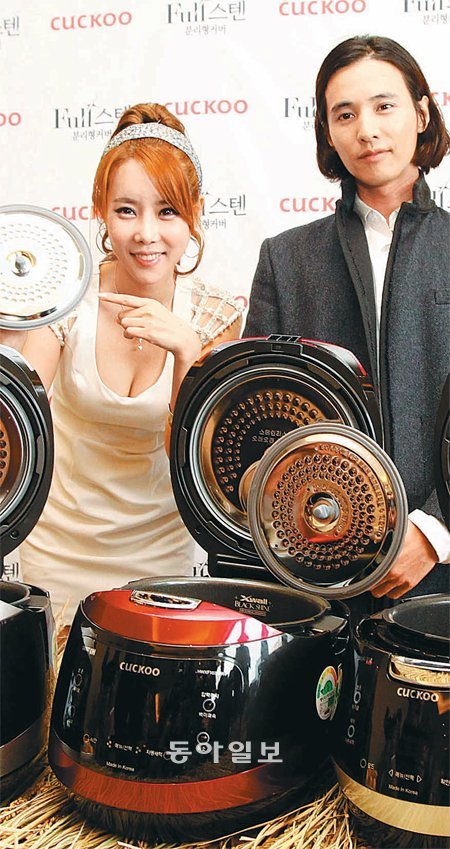 배우 원빈(오른쪽)이 9일 오전 서울 중구 소공동 플라자호텔에서 쿠쿠홈시스의 신제품인 ‘풀 스텐 분리형 커버’를 선보이고 있다. 풀 스텐 분리형 커버는 뚜껑 전체가 스테인리스 재질로 제작돼 있어 고온과 고압, 고스팀에 강한 것이 특징이다.