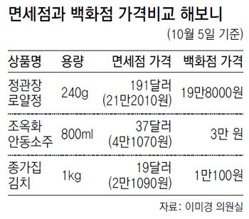 가격 차이가 가장 큰 제품은 김치였다. 주로 외국인들이 사가는 ‘종가집 김치’(1kg)는 롯데, 신세계 백화점 본점 판매 가격이 5일 1만100원이었지만 인천공항 면세점에서는 같은 날 19달러(약 2만1090원)에 판매됐다. ‘조옥화 안동소주’ 역시 면세점에서 37달러(약 4만1070원)에 팔려 백화점 판매가격 3만 원보다 1만 원 이상 비쌌다.