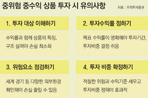 상품의 위험요인도 미리 점검해야 한다. 중위험 중수익 상품은 뜻하지 않게 큰 자금을 잃을 가능성이 항상 존재한다. 세계 경기 등 다양한 외부환경이 상품의 수익률에 어떤 영향을 미칠지 감안해 투자를 결정하는 게 유리하다.