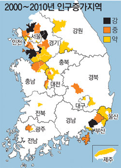 한국의 인구구조는 어떻게 변화하고 있을까. 통계청에 따르면 2000∼2010년 한국의 인구는 244만 명 늘었다. 2010년 현재 전국 251개 시군구 중 인구가 늘어난 곳은 101개, 줄어든 곳은 150개였다. 인구증가 지역에서는 405만 명이 늘었고, 감소 지역에서는 193만 명이 줄었다.
