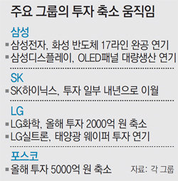 SK그룹은 반도체 시황이 나아질 기미를 보이지 않자 SK하이닉스의 투자 규모를 당초 4조2000억 원에서 소폭 줄이기로 했다. LG화학은 올해 계획했던 2조5000억 원의 투자액 가운데 2000억 원을 줄였으며, 내년에는 올해보다 2000억 원 적은 2조1000억 원가량만 투자하기로 했다. 포스코도 8조9000억 원으로 잡았던 올해 투자 예정액에서 5000억 원 정도를 줄여 집행할 계획이다.