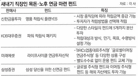 또 노후에 연금처럼 일정 금액을 다달이 받는 것이 관심사인 새내기 직장인들을 위해 연금펀드도 여러 종류가 나와 있다. 연금펀드는 연간 불입금액의 400만 원까지 소득공제를 받을 수 있다는 게 가장 매력적인 상품이다.