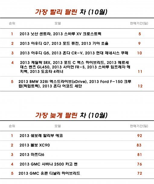 지난 10월 한 달 미국에서 ‘가장 빨리 팔린 차’와 ‘가장 늦게 팔린 차’를 집계한 결과가 공개됐다.