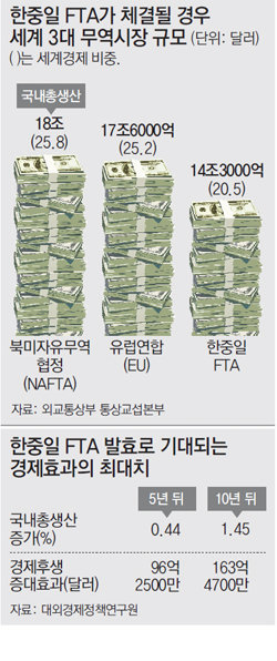 그러나 한중일 FTA는 어느 쪽도 쉽게 포기할 수 없는 선택이다. FTA가 타결돼 세 나라가 하나의 지역 통합시장으로 묶인다면 북미자유무역협정(NAFTA·2011년 명목 국내총생산 18조 달러)과 유럽연합(EU·17조6000억 달러)의 뒤를 잇는 세계 3위의 시장(14조3000억 달러·1경5587조 원)으로 급부상한다.