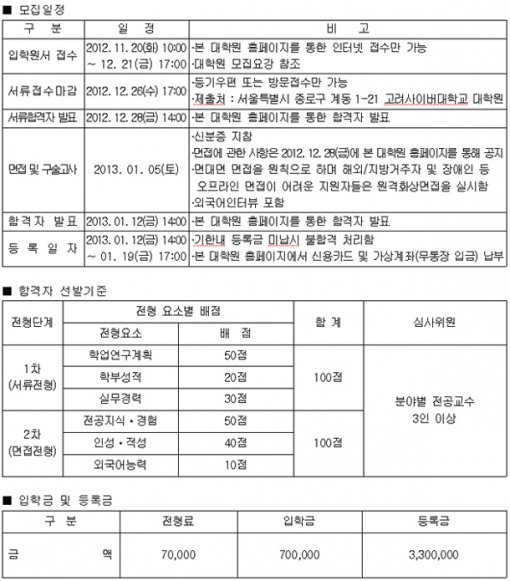 김중순 총장고려사이버대학교(총장 김중순)가 지난 달 31일 교육과학기술부로부터 학제정보대학원 설립인가를 최종 통보받고 11월 20일부터 첫 신입생 모집에 들어간다. 전공은 학제정보학이며 입학정원은 30명이다. 학사학위를 취득한 사람이면 출신대학의 전공과 관계없이 지원가능하고, 합격자는 1차 서류전형 2차 면접전형을 거쳐 선발한다. 서류전형은 학업연구계획과 학부성적, 실무경력이 포함되며, 면접전형에서는 전공지식·경험, 인성·적성, 외국어능력을 중점적으로 평가한다. 해외/지방거주자, 장애인 등 별도의 사유가 있는 지원자는 화상면접으로 대체할 수도 있다.