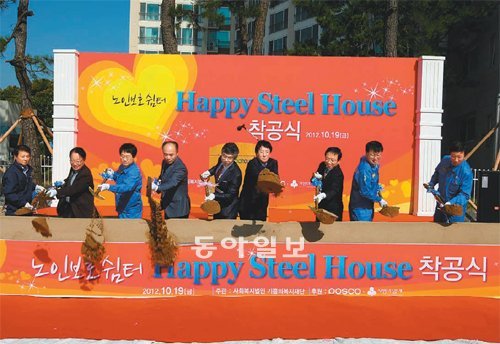 포스코패밀리 임직원들은 기본급의 1%를 기부하는 ‘1% 나눔운동’을 통해 포항지역 노인을 위한 보호시설인 ‘해피 스틸하우스’를 건립했다. 지난해 11월부터 회사는 동일한 금액을 일대일의 비율로 후원해 기금을 마련해왔다. 이 기금은 해피하우스 건립뿐 아니라 다문화가정 지원에도 사용된다.