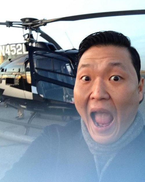 사진 속 싸이는 전용기를 배경으로 특유의 익살스러움과 함께 입을 벌리고 놀란 듯한 표정을 짓고 있다.