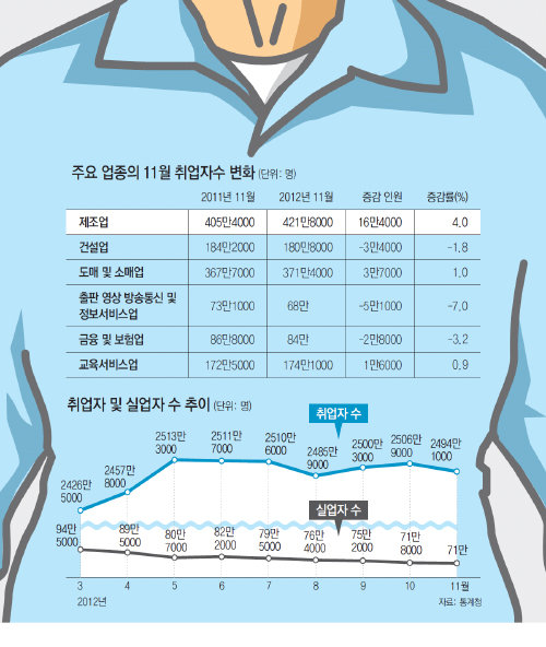 12일 통계청의 11월 고용동향이 발표되자 기획재정부, 고용노동부 등 일자리와 관계된 정부 부처 담당자들이 혼란에 빠졌다. 11월 중 전체 취업자 수 증가폭은 줄었지만 11월 중 ‘제조업’ 분야의 취업자 수는 지난해 같은 달보다 16만4000명이 늘면서 오히려 증가폭이 커졌기 때문이다. 재정부 당국자는 “통계가 잘못된 건 아니겠지만 최근 전반적으로 침체된 국내 산업계의 동향을 볼 때 제조업 일자리 증가는 예상하지 못했던 일”이라고 말했다. 일각에서는 “경제 사정이 나빠지면서 그동안 제조업체 등을 외면하던 30대 청년층, 50대 퇴직 장년층이 동시에 제조업으로 움직이고 있다”는 분석도 나온다.