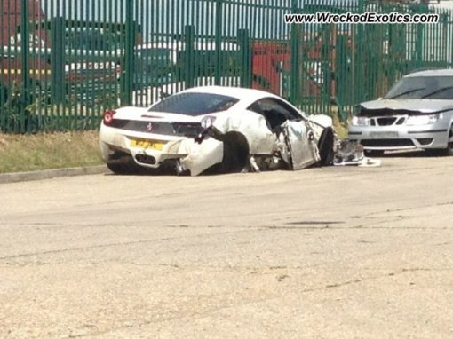 사진 속에는 심각하게 파손된 흰색 페라리 ‘458 이탈리아’ (약 3억7000만 원 상당) 차량의 모습이 담겨있다.