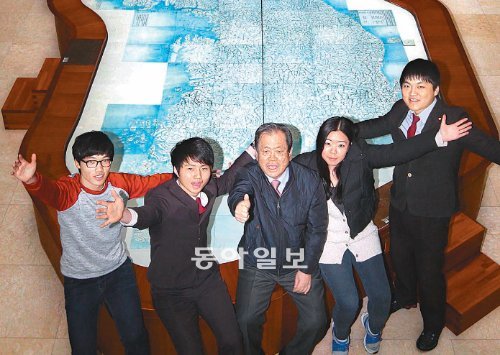 이지송 한국토지주택공사(LH) 사장(가운데)이 올해 고졸 공채 남녀 합격자 4명과 함께 경기 성남시 분당구 정자동 본사에 있는 대형 한반도 지도 앞에서 새로운 도약을 다짐하고 있다. 성남=장승윤 기자 tomato99@donga.com