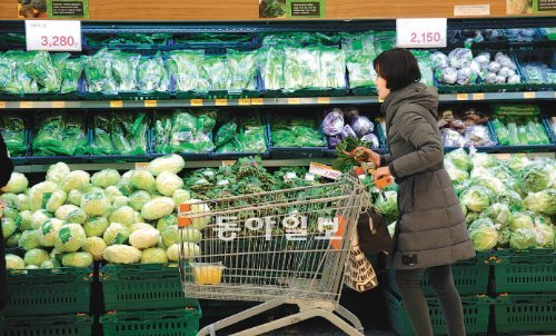 3일 서울의 한 대형 마트를 찾은 주부가 야채를 고르고 있다. 이날 서울 최저기온이 영하 16.4도까지 떨어지는 등 기록적인 한파가 이어지면서 무와 대파, 시금치 등 채소 가격이 폭등하고 있다.