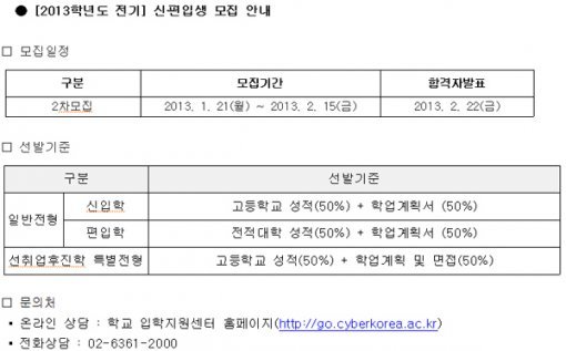 한편, 고려사이버대학교는 2월 15일까지 2차 신.편입생을 모집한다. 성적(50%)과 학업계획서(50%)를 반영하지만 당락은 학업계획서에서 대부분 결정된다. 선취업후진학 특별전형 등 풍부한 장학혜택도 마련돼 있다. 자세한 내용은 입학지원센터(go.cyberkorea.ac.kr)에서 확인할 수 있으며, 입학상담 전화(6361-2000)도 가능하다.