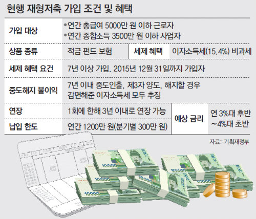 1995년 정부의 예산 부족으로 폐지됐다가 다음 달 다시 선보이는 재형저축은 7년 이상 가입할 경우 이자소득세(15.4%)를 내지 않는 비과세 금융상품으로 형태도 적금(은행), 펀드(자산운용사), 보험(보험사) 등으로 다양하다.