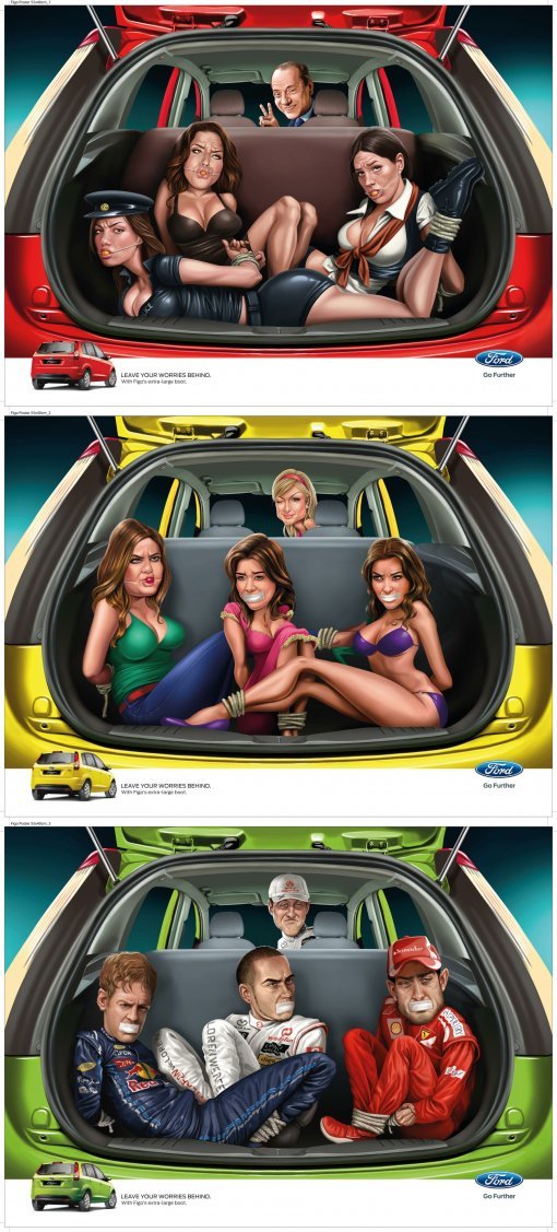 포드 인도법인은 소형차 ‘피고(미국명 피에스타)’ 해치백의 넉넉한 트렁크 공간을 강조하고자 세 명의 여성들이 팔다리가 묶이고 재갈이 물린 채 트렁크에 갇혀있는 모습이 담긴 인쇄광고를 제작해 물의를 사고 있다.