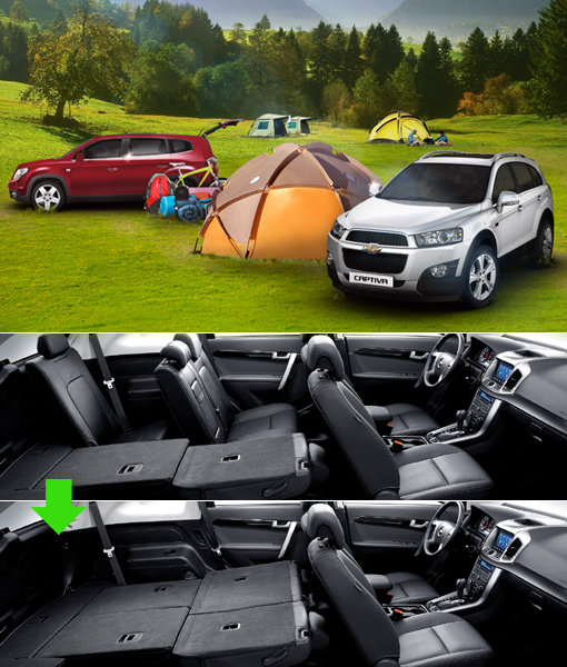쉐보레 캡티바 2013형은 세련된 외관과 듀얼 존 에어컨 시스템, 열선시트, 크루즈 컨트롤 등 편의성을 높여 장거리 가족여행에 어울리는 7인승 SUV다. 아래 두 사진은 2열과 3열 시트에 자유롭게 폴딩이 가능한 ‘이지테크’ 기능을 적용한 실내 공간. 사진제공|한국지엠주식회사