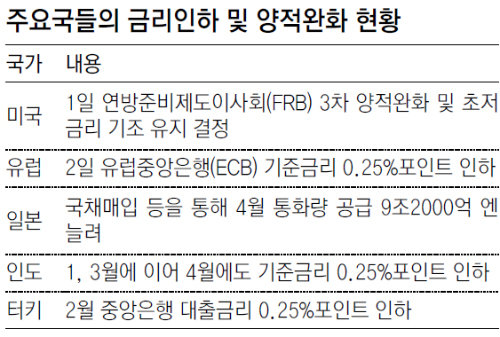 올 초까지 금리인하에 부정적인 태도를 유지했던 유럽중앙은행(ECB)은 2일(현지 시간) 기준금리를 0.25%포인트 낮추면서 양적완화 진영에 동참했다. 미국 일본에 이어 유럽까지 ‘글로벌 빅3 경제권’이 모두 양적완화에 돌입한 셈이다.
