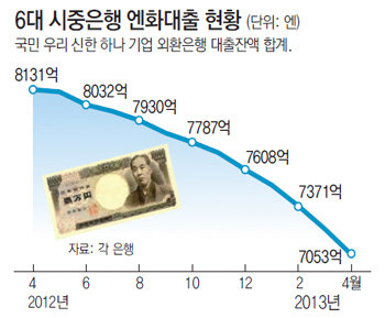 엔화 약세가 지속되면서 원-엔 환율이 2008년 9월 이후 4년 8개월 만에 최저 수준으로 떨어졌지만 시중은행의 엔화 대출은 갈수록 감소하고 있다. 보통 환율이 하락하면 그만큼 외화 대출에 따르는 부담이 줄어 대출이 늘지만 기업들이 과거 엔화 대출에 크게 데인 상처를 떠올리며 각별히 ‘몸조심’을 하고 있어서다.