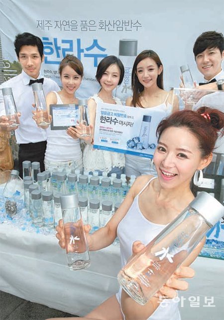 제주도개발공사는 23일 서울 종로구 청계광장에서 제주 화산암반수로 만든 프리미엄 먹는 샘물 ‘한라수’를 선보였다. 이날 행사는 한라수와 기존 제품인 삼다수를 소개하는 공식 페이스북 페이지(www.facebook.com/samdasoostory) 오픈 홍보도 겸해서 열렸다.
