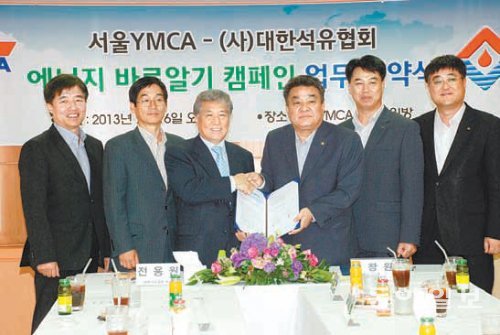 대한석유협회는 16일 서울 종로구 YMCA회관에서 서울YMCA의 ‘청소년 에너지 바로알기 캠페인’을 후원하는 업무협약식을 열고 지원금 2억 원을 전달했다. 행사에 참석한 신승국 SK에너지 상무, 이영원 GS칼텍스 상무, 전용원 대한석유협회장, 안창원 서울 YMCA 회장, 이정현 현대오일뱅크 상무, 이춘배 에쓰오일 팀장(왼쪽부터)이 기념촬영을 하고 있다.