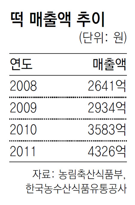 떡 시장이 급팽창하고 있다. 21일 농림축산식품부와 한국농수산식품유통공사(aT)가 발간한 ‘가공식품 세분화 시장 보고서’에 따르면 2011년 떡류의 매출액(출하액 기준)은 4326억 원이었다. 2008년 2641억 원 이후 연평균 성장률이 17.9%로 같은 기간 전체 식품시장의 평균 성장률(9.9%)보다 훨씬 높았다.