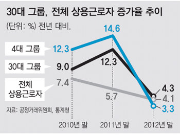 지난해 말 현재 30대 그룹의 임직원은 약 123만 명으로 전년(118만 명)보다 5만 명 증가했다. 전년 대비 증가율은 2011년 12.3%에서 지난해 4.3%로 떨어졌다. 특히 4대 그룹 평균 증가율은 같은 기간 14.6%에서 3.3%로 하락해 지난해 전체 상용근로자(1년 이상 취업 인구) 증가율(4.1%)에도 미치지 못했다.