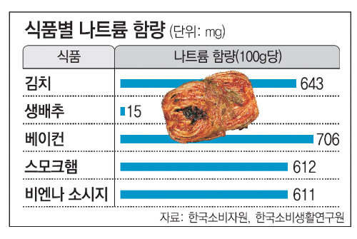 한국소비자원과 한국소비생활연구원은 22일 대형마트와 홈쇼핑 등에서 판매되는 16개 업체의 포기김치 16종을 시험 분석한 결과 김치 100g당 나트륨 함량이 540∼727mg으로 평균 643mg 들어 있었다고 밝혔다. 스모크햄(612mg), 비엔나소시지(611mg)보다 높은 수준이다.