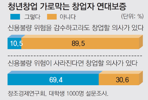 벤처업계에서는 창업자 연대보증을 폐지해야 하는 가장 큰 이유로 한번 실패하면 신용불량자로 전락해 재도전할 기회를 박탈당하는 점을 꼽는다. 이민화 창조경제연구회 이사장은 “미국 실리콘밸리에서 성공한 벤처기업이 평균 2.8회의 실패를 겪는다는 점을 감안하면 창업만큼 중요한 것이 실패와 재기”라고 강조했다.