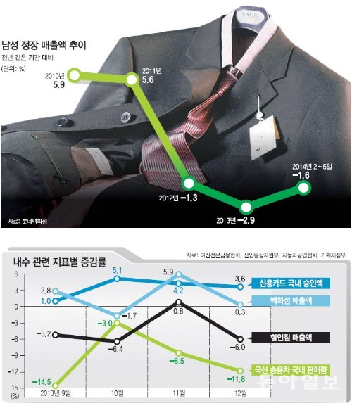 전문가들은 대표적인 불황 지표인 남성 정장의 매출이 여전히 되살아날 기미가 보이지 않는다는 데 주목하고 있다. 지난해 롯데백화점에서 남성 정장 매출액은 전년보다 2.9%나 줄었다. 2012년(―1.3%)보다 감소 폭이 더 커졌다. 남성 정장 매출 증가율은 2010년 5.9% 성장을 기록했다가 2011년 5.6%로 떨어지기 시작한 이후 해마다 감소하고 있다.