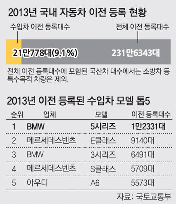 지난해 국내 중고차 시장에서 거래된 차량 가운데 수입차가 차지하는 비율이 9%를 넘어섰다. 3일 국토교통부에 따르면 지난해 국내에서 이전 등록된 중고차 231만6343대(국산차 중 특수목적차량은 제외) 가운데 수입차가 21만778대로 9.1%를 차지했다. 전년(7.8%) 대비 1.3%포인트 증가한 수치다.