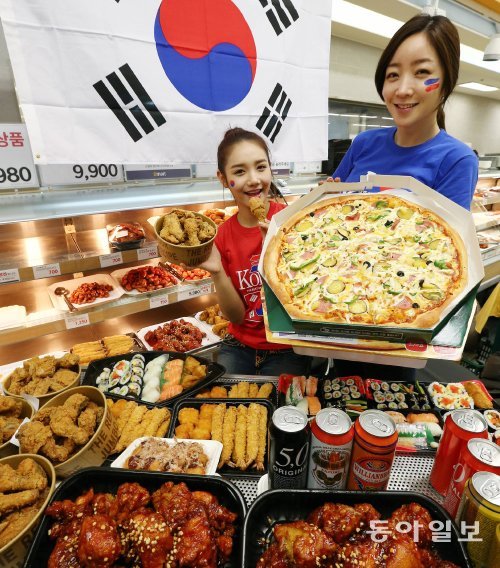 이마트는 소치 겨울올림픽이 끝나는 23일까지 치킨(6980원·1마리), 닭강정(1190원·100g) 등 대표적인 야식거리를 최대 30% 할인 판매하는 ‘응원 먹거리 모음전’을 연다. 9일 서울 용산구 한강대로 이마트 용산점에서 열린 이벤트에서 모델들이 행사 상품을 선보이고 있다.