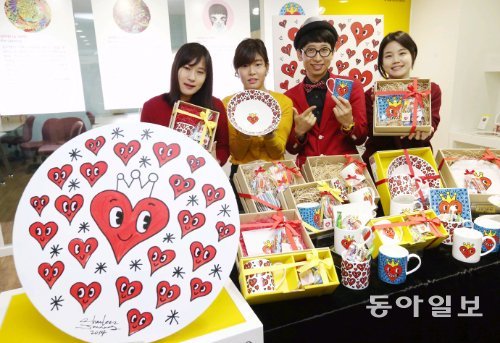 한국도자기는 밸런타인데이(14일)를 앞두고 팝아티스트 찰스 장(오른쪽에서 두 번째)이 디자인한 하트 무늬를 넣은 머그컵(1만2000원)과 접시(3만6000원) 등을 선보인다고 10일 밝혔다. 한국도자기는 이날 서울 서대문구 연희로 연희점에서 제품을 선보이는 판촉 행사를 열었다.