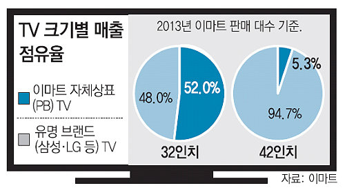 최 씨처럼 저렴한 소형 TV 제품을 찾는 사람이 늘고 있다. 이에 따라 소형 TV 시장에서는 유통사 자체상표(PB) 제품과 중국산이 유명 브랜드의 시장 점유율을 야금야금 갉아먹는 상황이다. 지난해 이마트가 판매한 32인치 TV의 경우, 판매 대수 기준으로 이마트 PB 제품의 매출 비중이 52%나 됐다. 유명 브랜드 TV의 시장 점유율은 48%였다.