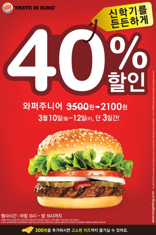 프리미엄 햄버거 브랜드 버거킹(대표 문영주)이 신학기를 맞이하여 3월 10일부터 12일까지 3일간 정가 3,500원의 와퍼주니어 단품을 40% 할인된 2,100원에 판매하는 프로모션을 진행한다.